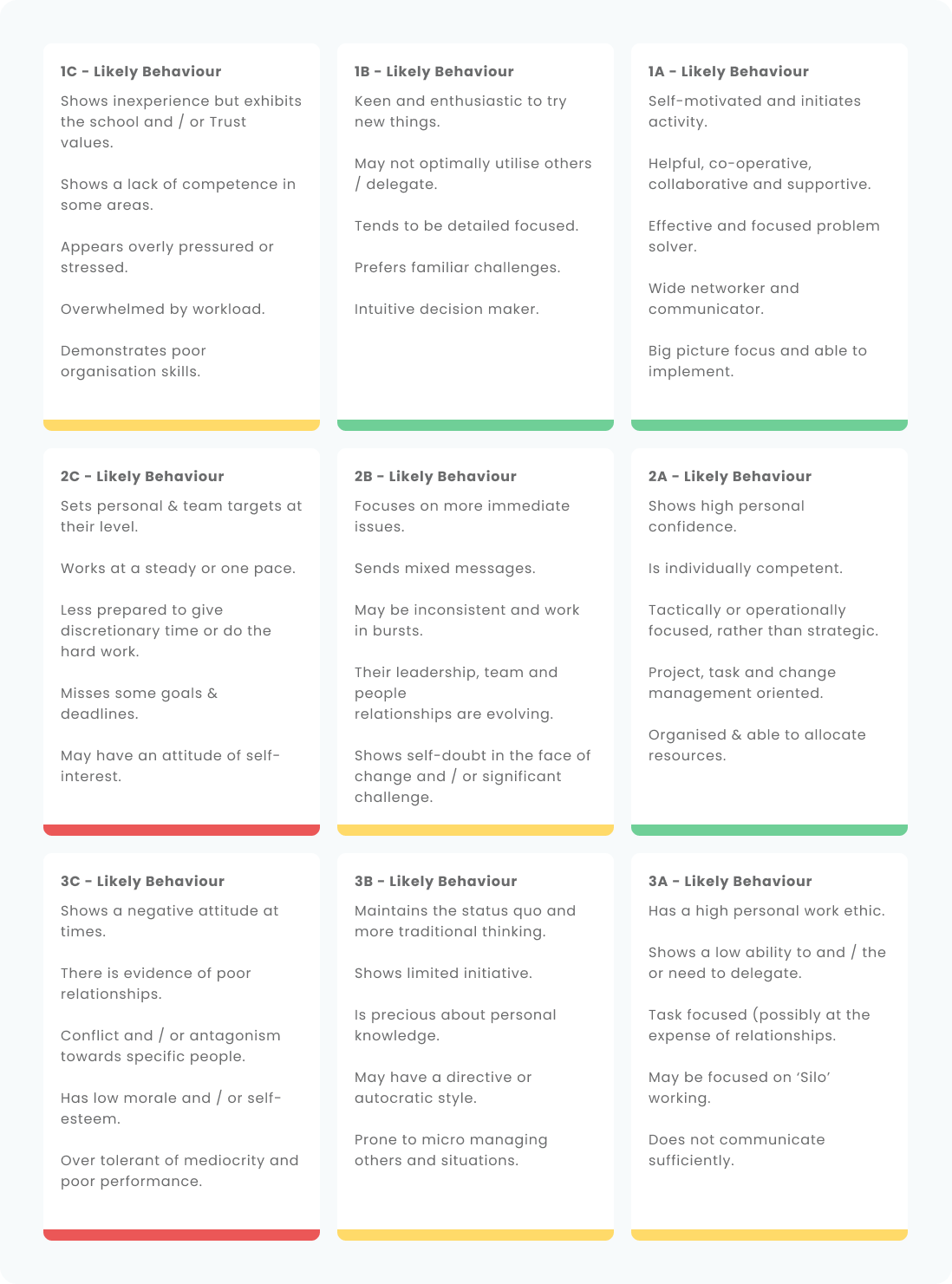 Below are a set of descriptors that describe the likely attributes of a staff member within each category. You can use this to double check where staff members have been placed following their review and to ensure that they are sitting in the right box.